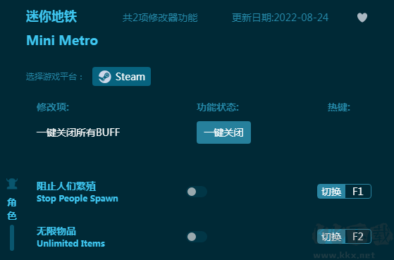 迷你地铁实用修改器为《迷你地铁》玩家带来两项实用修改辅助功能,包括阻止人类繁殖,以及无限物品。有了这项功能,帮助玩家无限扩张地铁版图,为全世界铺上地铁!感兴趣的朋友不要错过,KK下载站推荐大家下载体验!