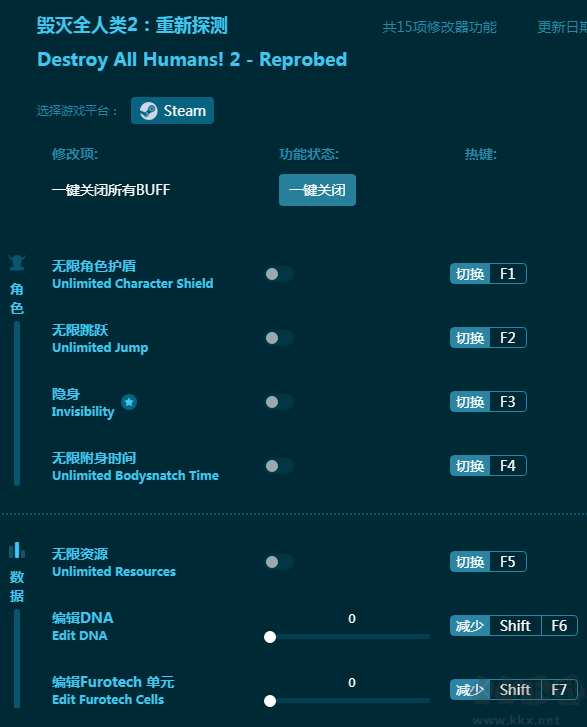 毁灭全人类2重新探测修改器是针对《毁灭全人类2重新探测》出品,且全新制作,带来更强力全能的十五项辅助功能。包括无限角色护盾,无限跳跃,隐身,无限附身时间等等,一定能帮助玩家神不知鬼不觉的消灭全人类!感兴趣的朋友不要错过,KK下载站推荐大家下载体验!
