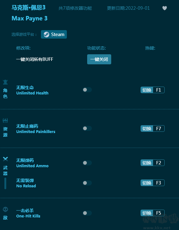 马克思佩恩3修改器是一款针对《马克思佩恩3》出品的游戏辅助工具。内置七项游戏辅助功能,包括无限生命,无限止痛药,无限弹药,无需装弹等等强力功能。在这款第三人称FPS游戏中,为玩家提供最无敌的游戏辅助,让玩家游戏体验爽上天!感兴趣的朋友不要错过,KK下载站推荐大家下载体验!