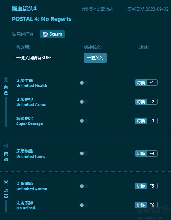 喋血街头4是一款超级讽刺且粗暴的开放世界射击游戏。KK小编为大家带来游戏的最新修改辅助软件《喋血街头4修改器》,内置九项辅助功能:无限生命,无限护甲,超级伤害,无限物品等等,帮助玩家完成那些极具讽刺性的任务,做一个真正的街头狂徒!感兴趣的朋友不要错过,KK下载站推荐大家下载体验!