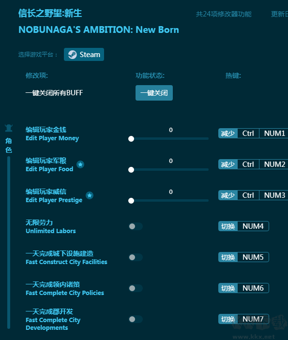 信长之野望新生修改器专为游戏《信长之野望新生》开发,内置全能二十四项游戏辅助功能,进入游戏就能直接使用,快捷简单。二十四项功能包括金钱,军粮,威信,劳动力,建造等等,帮助玩家获得最大游戏帮助,让玩家玩的更爽!感兴趣的朋友不要错过,KK下载站推荐大家下载体验!
