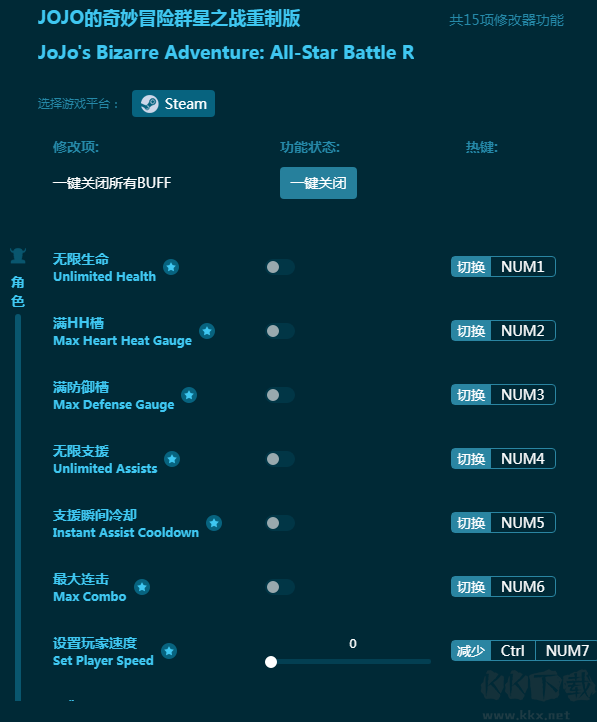 《JOJO的奇妙冒险群星之战重制版修改器》提供十五项游戏辅助修改功能,包括无限生命,满HH槽,满防御槽,无限支援,最大连击,设置玩家速度等等,让玩家在游戏中无所畏惧,获得更佳的游戏体验!感兴趣的朋友不要错过,KK下载站推荐大家下载体验!