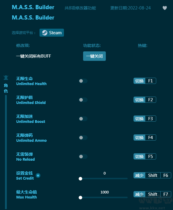 《MASSBuilder》是一款泰国动作机甲冒险游戏。假使你的战斗骨骼机甲对抗异世界怪兽入侵。使用本款《MASSBuilder修改器》让玩家战无不胜,获得生命,护盾,加速,弹药等多项游戏辅助,异世界怪物不堪一击,游戏体验更爽!感兴趣的朋友不要错过,KK下载站推荐大家下载体验!