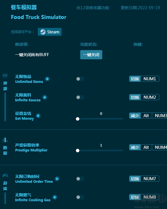餐车模拟器是一款餐车模拟经营游戏,玩家继承餐车踏上发扬光大的餐车之旅。KK小编为大家带来这款《餐车模拟器修改器》,内置十二项游戏辅助功能,能够帮助玩家得到无限物品,金钱,燃气等功能,让玩家零成本赚钱!感兴趣的朋友不要错过,KK下载站推荐大家下载体验!