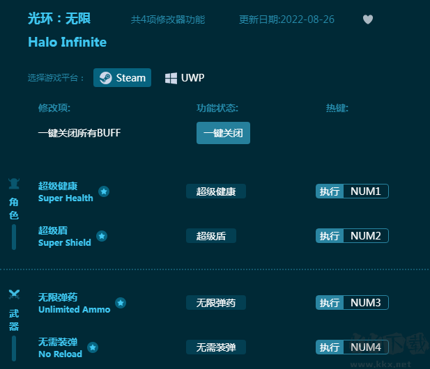 《光环:无限》是一款包含了众多玩法的大型游戏,在全新世界探索士官长的故事。KK小编提供本款《光环:无限修改器》,内置四项游戏辅助,包括健康,盾,弹药等等,让玩家无所畏惧,游戏体验更爽快!感兴趣的朋友不要错过,KK下载站推荐大家下载体验!