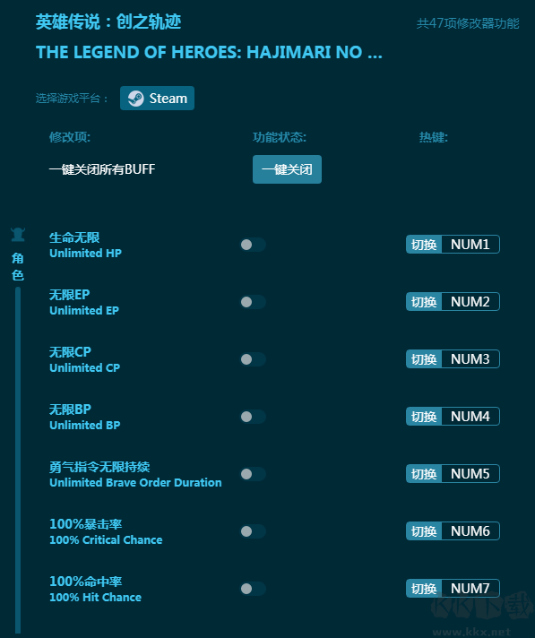《英雄传说:创之轨迹》是英雄传说系列的又一力作,全新多平台角色扮演,深入探索每一个角色。同时带来《英雄传说:创之轨迹修改器》提供全能游戏辅助,四十七项游戏辅助功能玩家可以自由开启无限生命,无限ep,无限cp,无限bp等功能,让玩家获得更优质的游戏体验!感兴趣的朋友不要错过,KK下载站推荐大家下载体验!