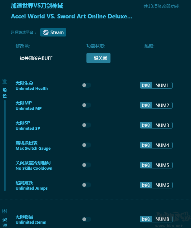 《加速世界VS刀剑神域修改器》提供十三项游戏辅助功能,包括无限生命,无限MP,无限sp,满切换量表,超高跳跃等等,玩家自由使用,让游戏更轻松,体验更爽快!感兴趣的朋友不要错过,KK下载站推荐大家下载体验!
