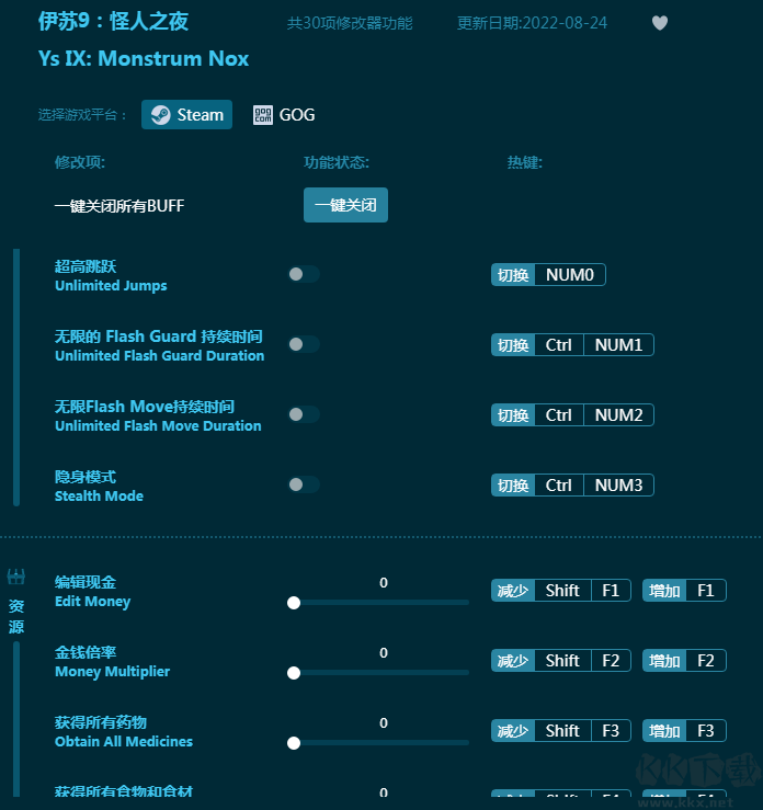 《伊苏9:怪人之夜修改器》专门针对游戏《伊苏9:怪人之夜》而开发,全套三十项游戏辅助功能,涵盖游戏的各方面属性数据,全部提供玩家自由免费使用。无限生命,最大战斗力,无限金钱,超高跳跃等等三十项功能任你使用,让玩家的游戏体验更爽快!感兴趣的朋友不要错过,KK下载站推荐大家下载体验!