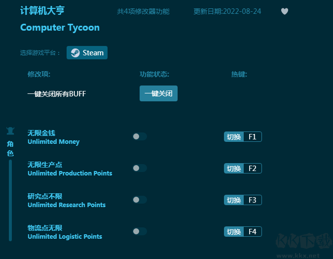 电脑大亨修改器是一款非常好用的游戏辅助工具,专为游戏《电脑大亨》打造。电脑大亨修改器提供四项强力辅助,无限金钱,无限生产点,无限研究点,无限物流点等等,玩家可以自由使用,打造自己的电脑帝国!感兴趣的朋友不要错过,KK下载站推荐大家下载体验!