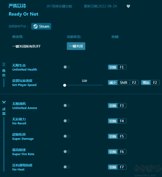 严阵以待修改器是一款非常实用的游戏辅助工具。专为《严阵以待》游戏打造,提供七项强力辅助包括无限生命,无限弹药,无后坐力,超级伤害等帮助,让玩家更轻松完成游戏任务,游戏体验更爽快!感兴趣的朋友不要错过,KK下载站推荐大家下载体验!