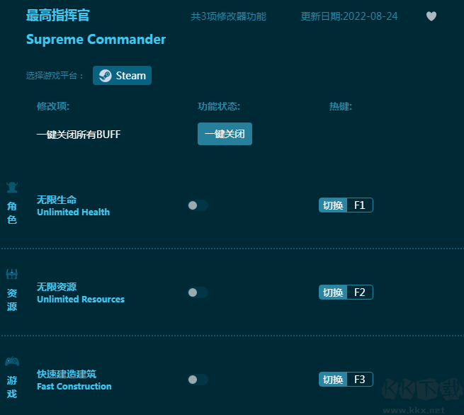 最高指挥官修改器是一款专为游戏《最高指挥官》打造的全能修改辅助工具。最高指挥官修改器提供玩家免费使用,内置无限生命,无限资源,快速建造等强力辅助,帮助玩家游戏体验更佳!感兴趣的朋友不要错过,KK下载站推荐大家下载体验!