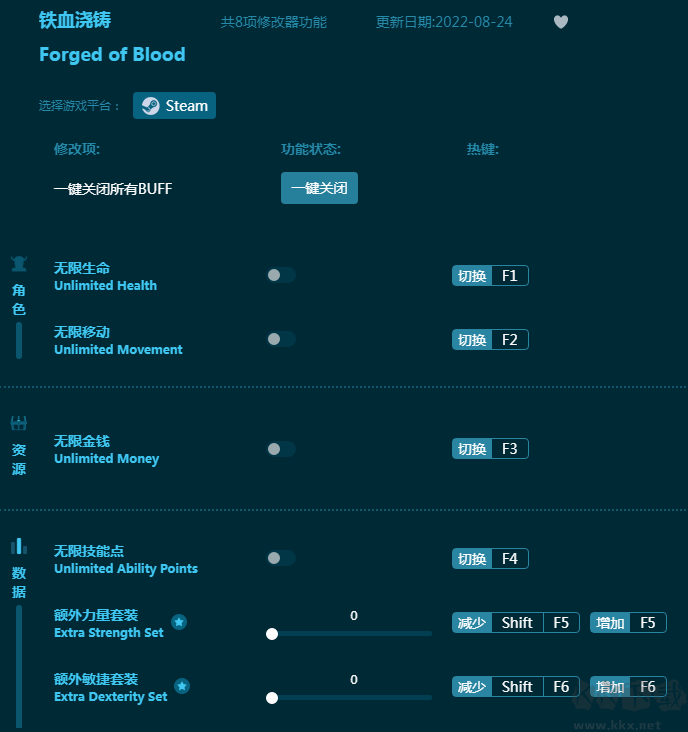 铁血浇铸修改器是一款针对游戏《铁血浇铸》打造的强力游戏辅助工具。内置八项游戏辅助功能,包括无限生命,无限移动,无限金钱,无限技能点等供玩家使用,帮助玩家获得更爽快的游戏体验!感兴趣的朋友不要错过,KK下载站推荐大家下载体验!