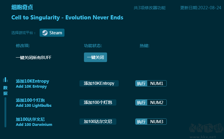 细胞奇点修改器是一款专为游戏《细胞奇点》打造的多功能游戏辅助工具。细胞奇点修改器为玩家带来无限灯泡,无限达尔文尼等游戏帮助,让玩家能够更轻松的进化成自己想要的物种!感兴趣的朋友不要错过,KK下载站推荐大家下载体验!