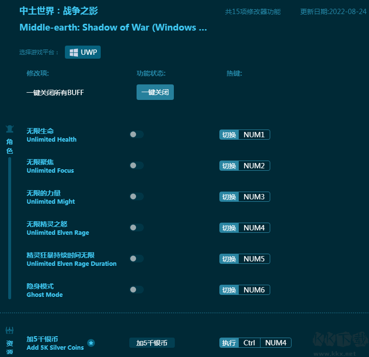 中土世界:战争之影修改器是一款专为游戏《中土世界:战争之影》打造的强力辅助工具。中土世界:战争之影修改器提供十五项游戏辅助,包括无限生命,无限聚焦,无限的力量,无限精灵之怒,隐身等等功能,让游戏更轻松,带来更爽快的游戏体验!感兴趣的朋友不要错过,KK下载站推荐大家下载体验!