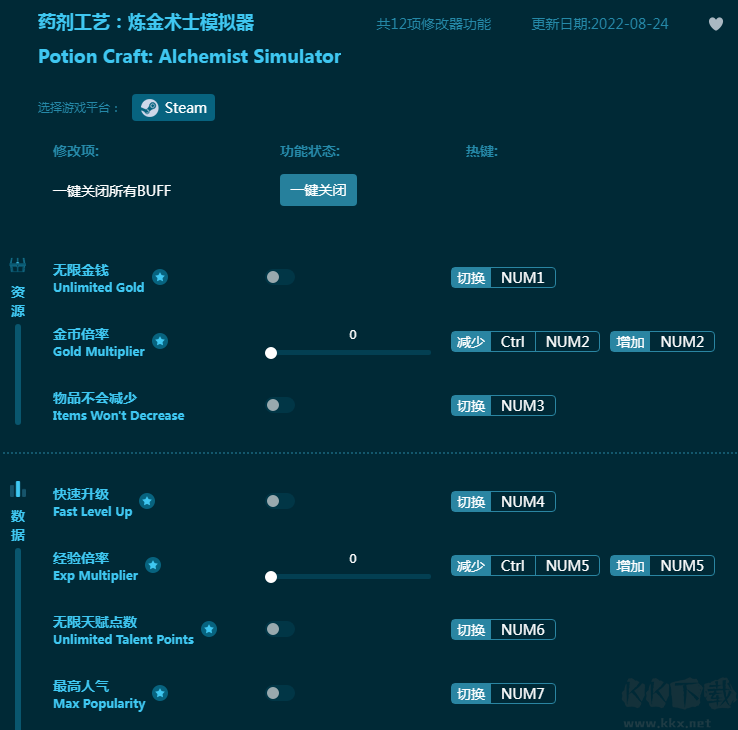 药剂工艺:炼金术士模拟器修改器是一款针对游戏《药剂工艺:炼金术士模拟器》出品的游戏修改器。内置十二项游戏修改功能,提供无限金钱,无限物品,快速升级,最高人气等强力功能,让玩家制作药剂更轻松,成为最好的药剂师!感兴趣的朋友不要错过,KK下载站推荐大家下载体验!
