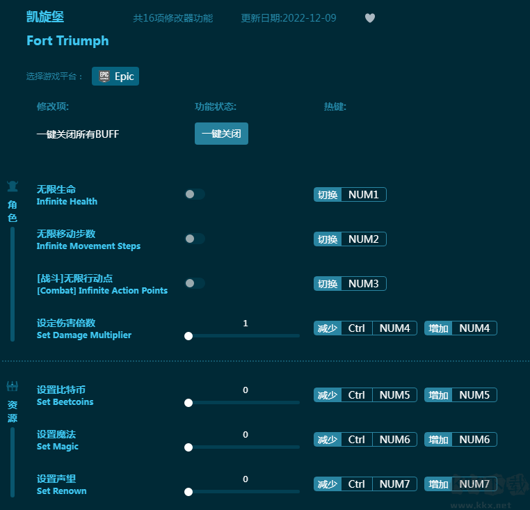 凯旋堡修改器是一款专为游戏《凯旋堡》出品的游戏修改器。内置十六项游戏修改功能,为玩家提供无限生命,无限移动步数,无限行动点,无限魔法等等功能,让玩家的魔幻冒险之旅更轻松,游戏体验更愉快!感兴趣的朋友不要错过,KK下载站推荐大家下载体验!