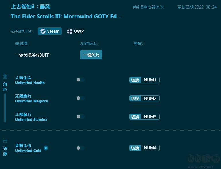 上古卷轴3:晨风修改器是一款针对游戏《上古卷轴3:晨风》出品的多功能修改器。上古卷轴3:晨风修改器提供玩家无限生命,无限魔力,无限耐力,无限金钱等游戏帮助,让玩家的游戏体验更爽快!感兴趣的朋友不要错过,KK下载站推荐大家下载体验!