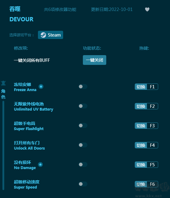 《吞噬Devour》是一款多人恐怖生存游戏,对抗邪教领袖,逃出地狱。这款《吞噬Devour修改器》能够帮助玩家拥有无限紫外线电池,超级手电筒,超级移动速度,打开所有车门等等功能,有了这些帮助,玩家可以轻松戏耍游戏BOSS,游戏体验更佳!感兴趣的朋友不要错过,KK下载站推荐大家下载体验!