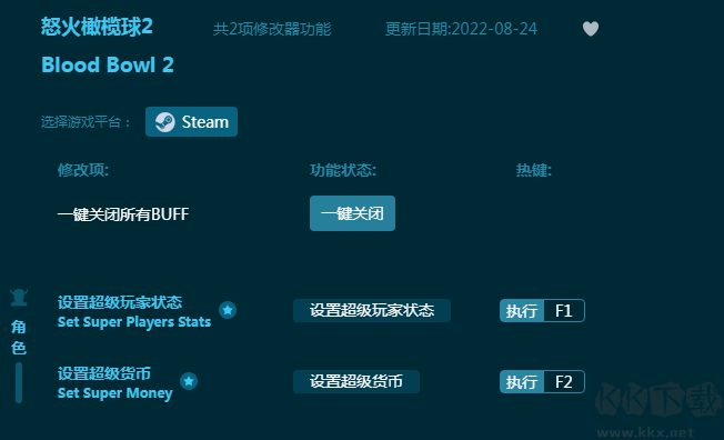 怒火橄榄球2修改器是一款专为游戏《怒火橄榄球2》出品的游戏修改器。内置多功能游戏修改功能,支持为玩家提供超级玩家状态,超级货币等等,让玩家的游戏体验轻松愉快!感兴趣的朋友不要错过,KK下载站推荐大家下载体验!