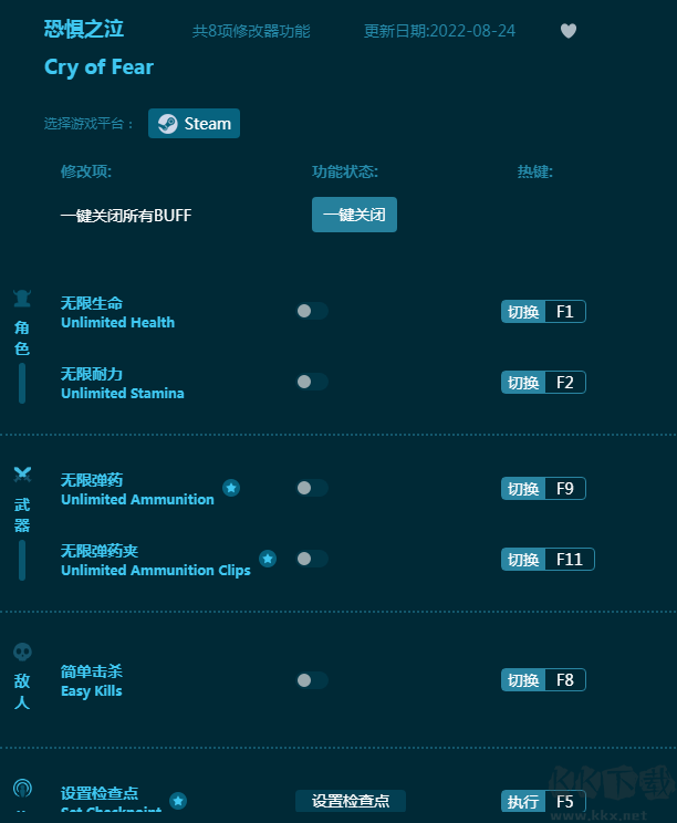 《恐惧之泣》是一款超级刺激的恐怖射击游戏,玩家要独自对抗死亡城市中的病人怪物,并找到出路。这款《恐惧之泣修改器》能够提供玩家无限生命,无限耐力,无限弹药,无限弹药夹等丰富的游戏帮助,让玩家无所畏惧,游戏内容更精彩!感兴趣的朋友不要错过,KK下载站推荐大家下载体验!