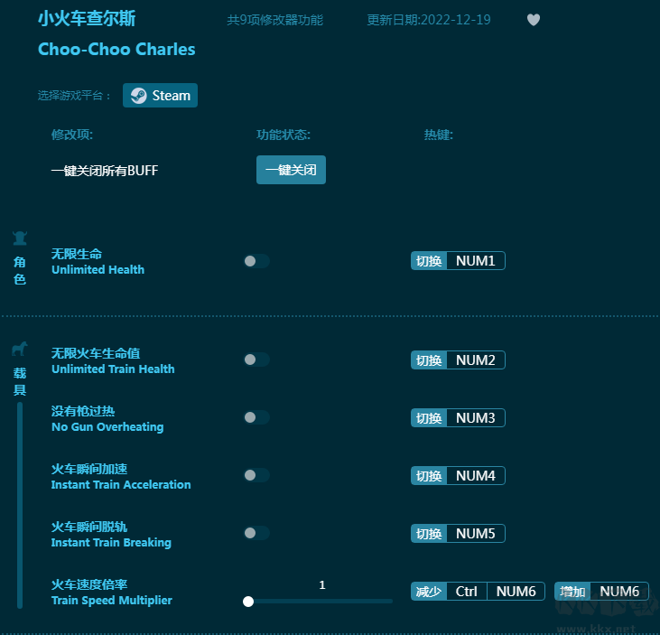 《查尔斯小火车》是一款铁路冒险游戏,玩家将驾驶小火车,和蜘蛛火车进行对抗。KK下载站带来《小火车查尔斯修改器》提供玩家无限生命,无限火车生命,瞬间加速,瞬间脱轨,没有枪过热等众多游戏帮助,帮助玩家轻松击退蜘蛛火车,游戏体验更轻松!感兴趣的朋友不要错过,KK下载站推荐大家下载体验!