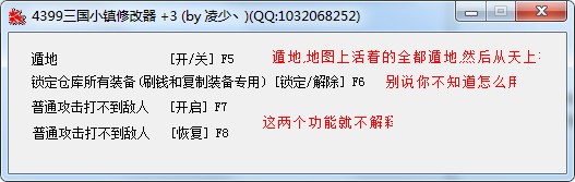 遁地 [开/关]F5 锁定仓库所有装备(刷钱和复制装备专用) [锁定/解锁] F6 普通攻击打不到敌人 [开启] F7 普通攻击打不到敌人 [恢复] F8