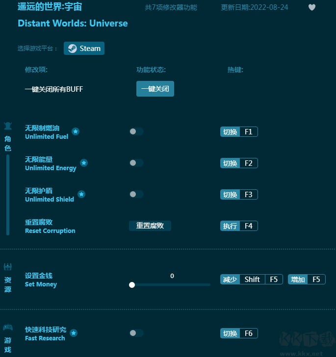 《遥远的世界:宇宙》是一款太空沙盒建造策略游戏,玩家能在这里体验宇宙的无限可能。这款《遥远的世界宇宙修改器》能够为玩家带来无限燃油,无限能量,无限护盾,无限金钱,快速研究科技等等,帮助玩家获得更轻松愉快的游戏体验!感兴趣的朋友不要错过,KK下载站推荐大家下载体验!