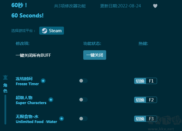 《60秒》是一款文字剧情生存游戏,收集物资在核弹后的地下避难所生存。这款《60秒修改器》为玩家带来超级人物,无限食物,无限水,冻结时间等游戏帮助,帮助玩家轻松各种意外情况,游戏体验更佳!感兴趣的朋友不要错过,KK下载站推荐大家下载体验!