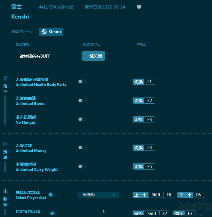 剑士kenshi修改器是一款专为游戏《剑士kenshi》出品的游戏修改器。剑士kenshi修改器提供无限健康,无限血液,无限金钱,没有饥饿感等众多游戏辅助,帮助玩家获得更轻松的游戏体验,感兴趣的朋友不要错过,KK下载站推荐大家下载体验!