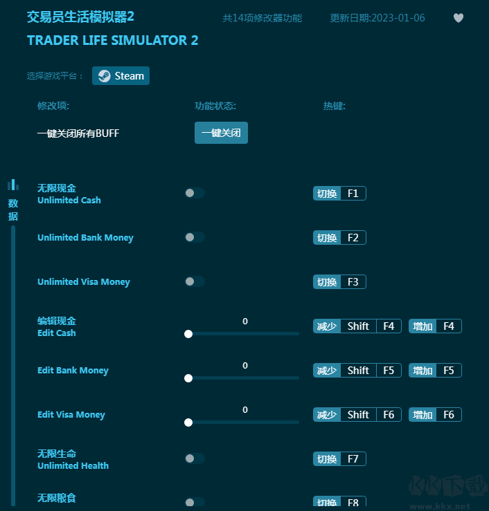 《交易员生活模拟器2》是一款沙盒模拟经营游戏,玩家要打造自己的贸易商业帝国。KK下载站带来《交易员生活模拟器2修改器》提供十四项游戏辅助,为玩家提供无限现金,无限生命,无限粮食,无限水资源等游戏帮助,为玩家的商业帝国提供助力,玩家游戏体验更佳!感兴趣的朋友不要错过,KK下载站推荐大家下载体验!