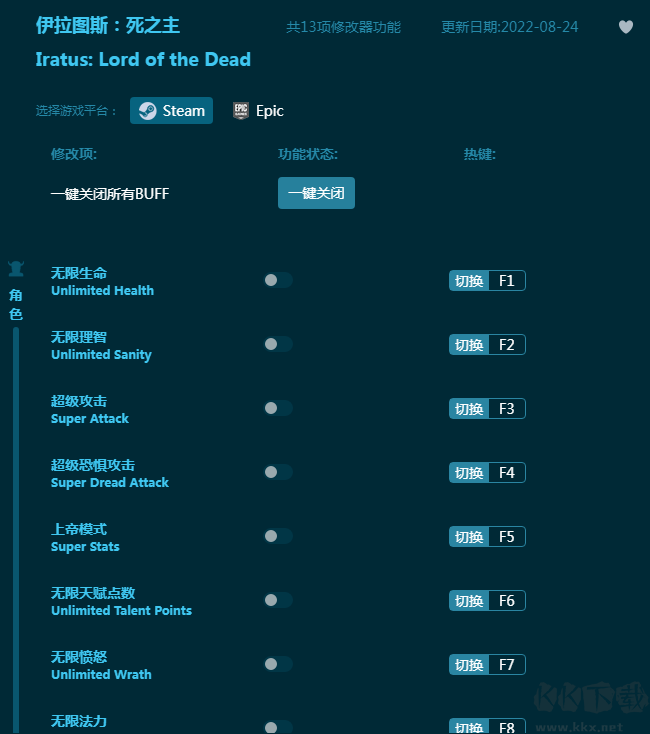 《伊拉图斯:死之主》玩家将扮演死灵法师,为黑暗而战。这款《伊拉图斯:死之主修改器》能为玩家带来无限生命,无限理智,超级攻击,无限愤怒,无限法力等强大的游戏辅助,帮助玩家获得更爽快的游戏体验!感兴趣的朋友不要错过,KK下载站推荐大家下载体验!