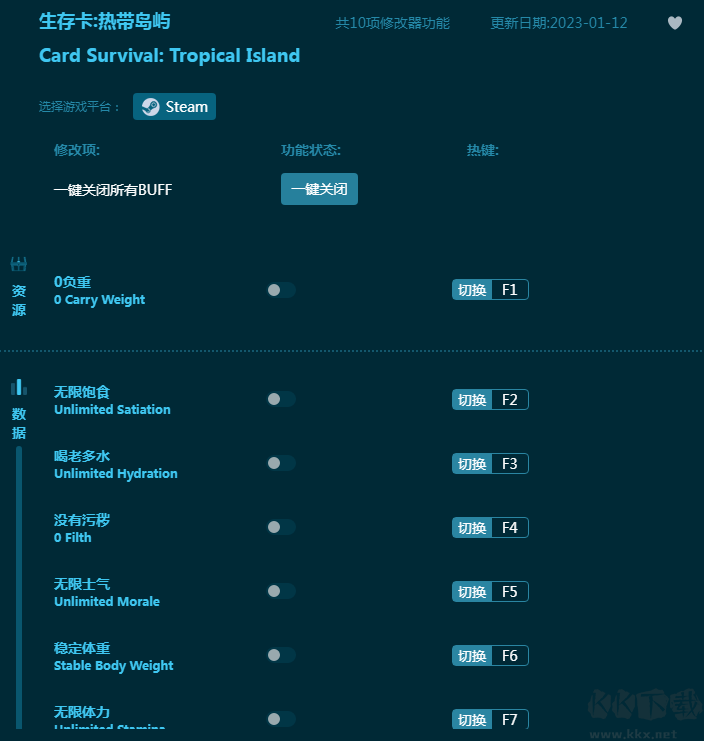 《卡牌生存:热带岛屿》将卡牌与生存结合,玩家流落孤岛,所有元素都以卡牌方式出现,你要怎么活下去。KK下载站带来《卡牌生存:热带岛屿修改器》为玩家提供零负重,无限饱食,没有污秽,无限士气,无限体力等等,帮助玩家生存更轻松,一定让你爱不释手!感兴趣的朋友不要错过,KK下载站推荐大家下载体验!
