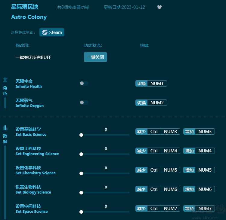 星际殖民地修改器专为游戏《星际殖民地》玩家出品,内置多项强力游戏服务,包括无限生命,无限氧气,基础科学,工程科技,空间科技,生物科技等等。有了这款星际殖民地修改器,让玩家的游戏体验更愉快轻松!感兴趣的朋友不要错过,KK下载站推荐大家下载体验!