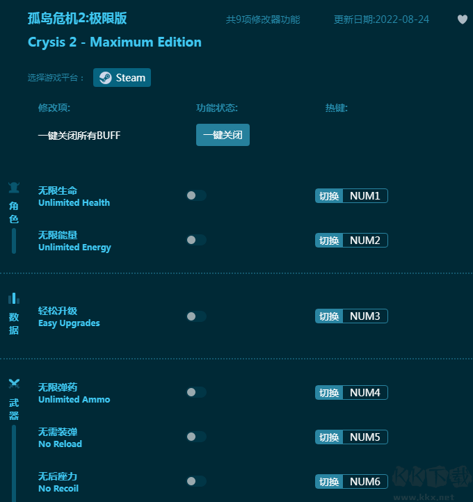 孤岛危机2:极限版修改器是针对游戏《孤岛危机2:极限版》出品,内置九项游戏辅助功能,包括无限生命,无限能量,无限弹药,无需装弹,无后坐力等强力功能。玩家自由使用,游戏体验更爽快!感兴趣的朋友不要错过,KK下载站推荐大家下载体验!