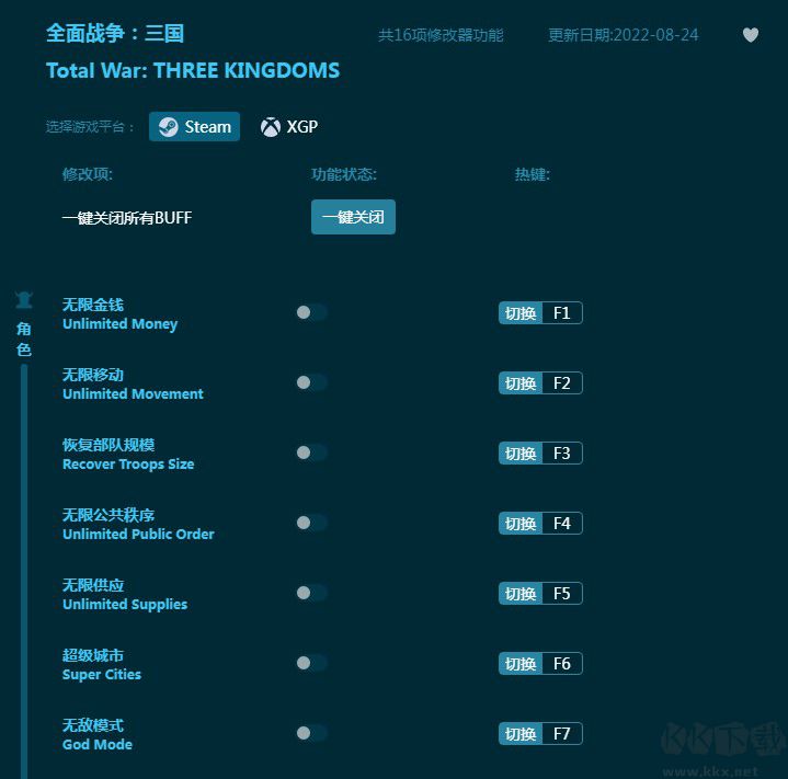 KK下载站为您提供全面战争三国修改器下载,修改器里面提供了无限金钱、无线移动、无限供应、无限箭矢、技能瞬间冷却、无限粮食、快速建造等丰富的修改功能。《全面战争:三国》是以三国历史为题材制作的一款大型即时战略游戏,游戏里面玩家可以操控不同的势力来完成统一三国的大业。这款全面战争三国修改器可以帮助我们大大降低游戏难度,让我们玩起来更加的轻松,有兴趣的朋友赶紧下载体验吧!