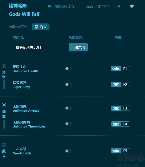 《诸神将陨》以打倒众神为目的,玩家将挑战世界各地的神明。这款《诸神将陨修改器》为玩家提供无限生命,超级跳跃,无限箭矢,一击必杀等强力游戏辅助,帮助玩家攻击更强力,轻松击倒众神!感兴趣的朋友不要错过,KK下载站推荐大家下载体验!