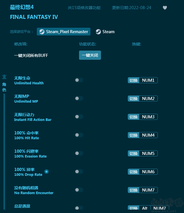 最终幻想4修改器是一款通用版强力游戏修改器,最终幻想4修改器提供玩家无限生命,无限行动力,无限MP,100%命中率,100%闪避率等等强力功能,帮助玩家拯救世界。游戏体验更愉快!感兴趣的朋友不要错过,KK下载站推荐大家下载体验!