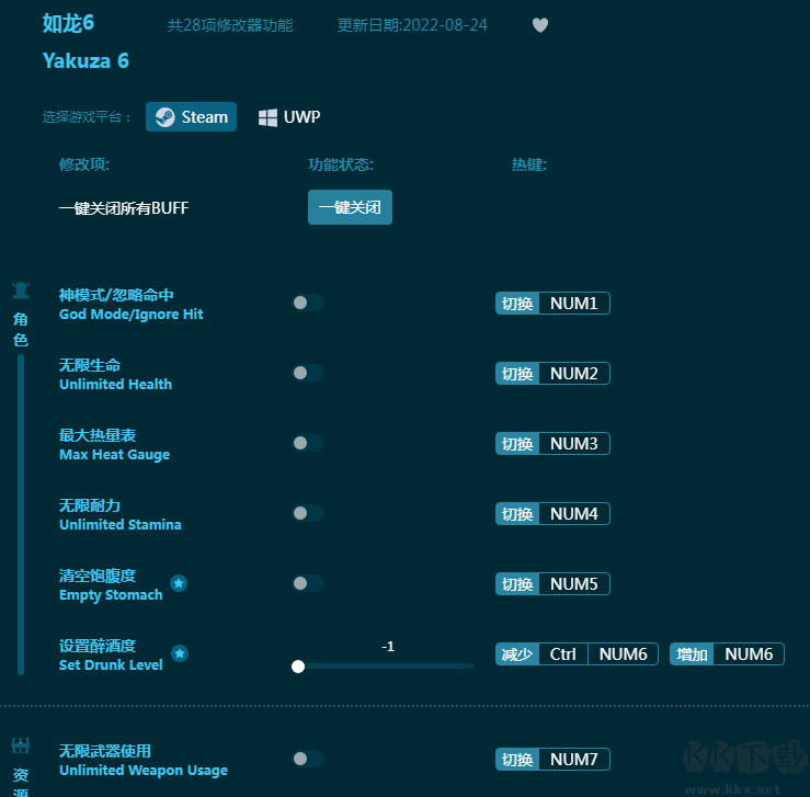 《如龙6》是如龙系列的第六作,玩家将继续扮演桐生一马,誓死查出导致女儿陷入昏迷的真相。这款《如龙6修改器》能够为玩家带来神模式,无限生命,最大热量表,无限耐力,无限武器使用,清空饱腹度等等强力辅助,帮助玩家获得更爽快的游戏体验,游戏体验更佳!感兴趣的朋友不要错过,KK下载站推荐大家下载体验!