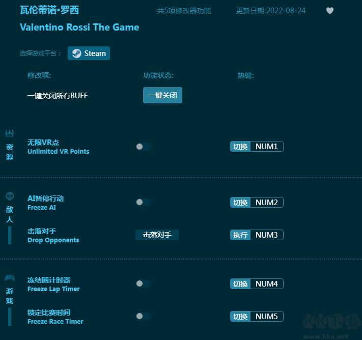 《瓦伦蒂诺罗西》是一款摩托赛车竞速游戏。这款《瓦伦蒂诺罗西修改器》为玩家带来无限VR点,击落对手,暂停行动等强力游戏辅助,帮助玩家在游戏中驾驶更爽快,游戏体验更佳!感兴趣的朋友不要错过,KK下载站推荐大家下载体验!