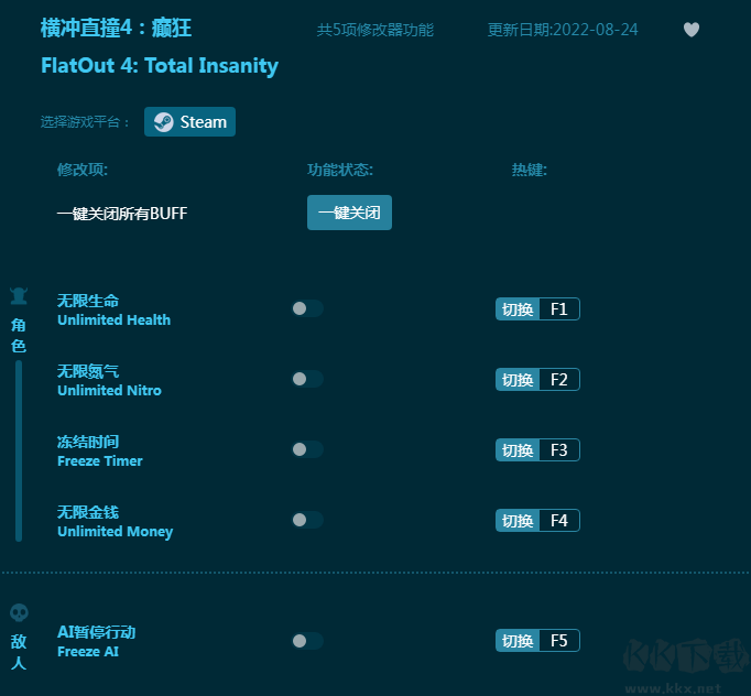 《横冲直撞4:癫狂》是超经典的赛车竞速游戏,横冲直撞系列第四作,带来全新飙车体验。这款《横冲直撞4:癫狂修改器》能提供玩家无限金钱,无限生命,无限氮气,AI暂停行动等辅助,给你最强劲的赛车马力,飙车绝对爽快!感兴趣的朋友不要错过,KK下载站推荐大家下载体验!