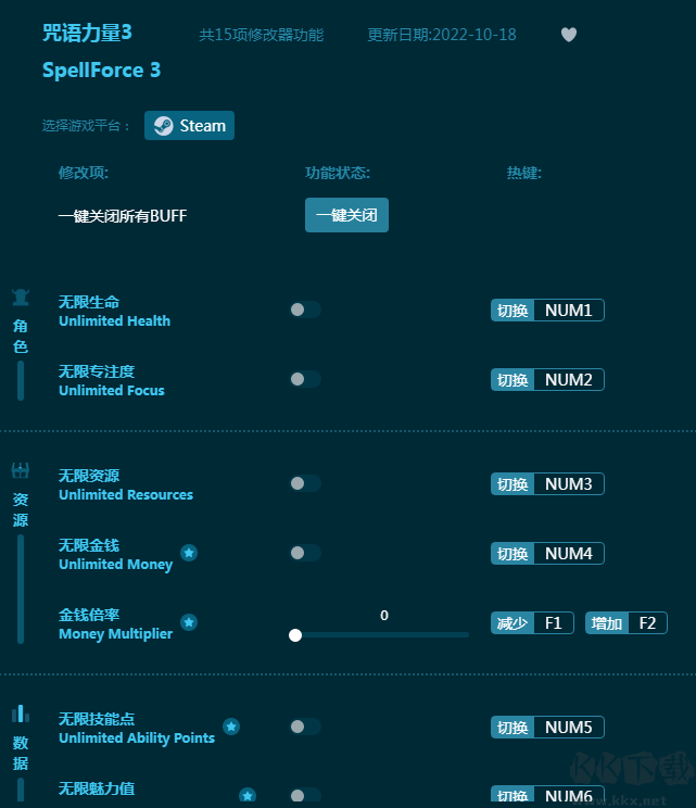 咒语力量3修改器是专为游戏《咒语力量3》打造的免费游戏修改器。咒语力量3修改器提供无限生命,无限专注度,无限资源,无限金钱,无限技能点,无限魅力值等等游戏辅助。有了这款修改器,玩家可扮演不同的种族,体验全面游戏内容!感兴趣的朋友不要错过,KK下载站推荐大家下载体验!