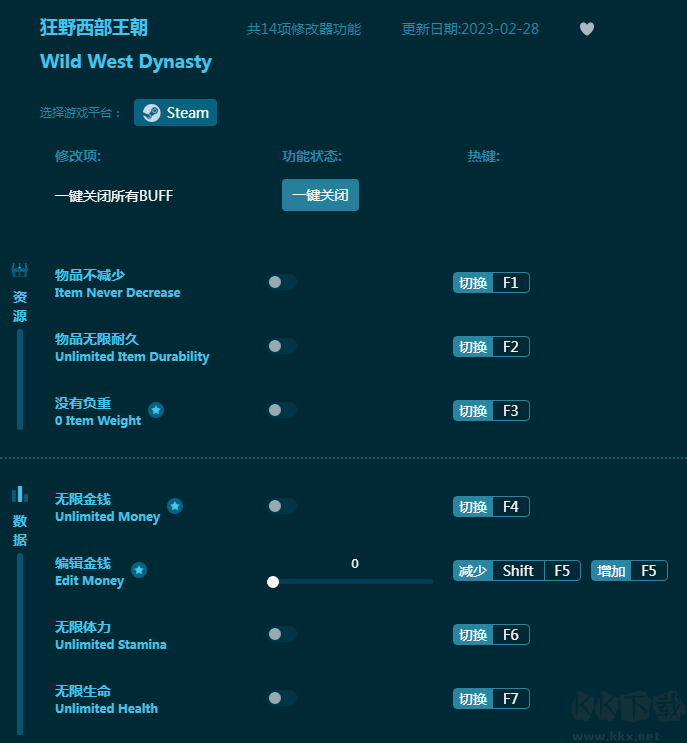 《狂野西部王朝》是一款全新的模拟经营游戏,西部冒险等你挑战。KK下载站提供这款《狂野西部王朝修改器》能为玩家提供无限物品,无限物品耐久,没有负重,无限金钱,无限体力,无限生命等等游戏帮助,让玩家的西部冒险更轻松,游戏体验更佳!感兴趣的朋友不要错过,KK下载站推荐大家下载体验!