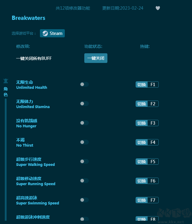 Breakwaters修改器是一款专为游戏《Breakwaters》打造的多功能游戏修改器,内置无限生命,无限体力,没有饥饿感,不渴,超级步行速度,超级移动速度,超高速游泳等等强力辅助,帮助玩家探索海洋世界,重建文明!感兴趣的朋友不要错过,KK下载站推荐大家下载体验!