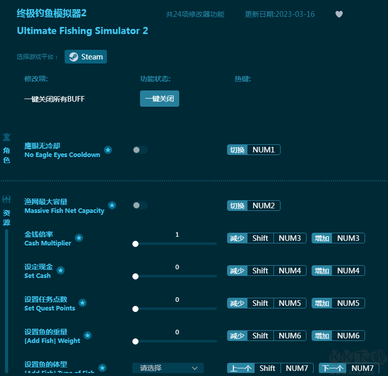 《终极钓鱼模拟器2》带来全新拟真钓鱼模拟游戏,在游戏里展现你的钓鱼技术。这款《终极钓鱼模拟器2修改器》能为玩家提供无限金币,无限鹰眼,渔网最大容量,渔具无限耐久等众多游戏辅助功能,帮助玩家在游戏中体验钓鱼的乐趣,永不空军!感兴趣的朋友不要错过,KK下载站推荐大家下载体验!