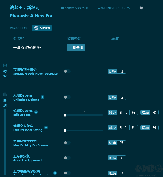 法老王新纪元修改器是一款专为游戏《法老王新纪元》打造的游戏修改器,内置丰富的游戏辅助功能,帮助玩家降低游戏难度。包括货物不减少,上帝被安抚,上帝总是给予祝福,最大生育力等等,玩家可以自由使用,建立你的超大城市!感兴趣的朋友不要错过,KK下载站推荐大家下载体验!