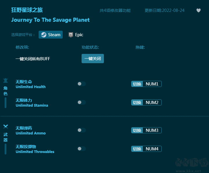 《狂野星球之旅》展开神秘的星球冒险,记录探索这颗星球的各种情况。这款《狂野星球之旅修改器》为玩家带来无限生命,无限体力,无限弹药,无限投掷物等众多游戏辅助功能,为玩家探索星球提供助力,游戏体验更轻松愉快!感兴趣的朋友不要错过,KK下载站推荐大家下载体验!