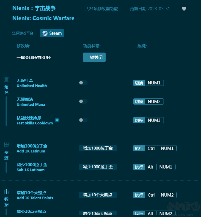 《Nienix宇宙战争》开启宇宙冒险,整片宇宙等你探索。这款《Nienix宇宙战争修改器》为玩家带来无限生命,无限魔法,技能快速冷却,无限天赋点,无限拉丁金等游戏帮助,让玩家轻松打败追击的敌人,宇宙任你创,游戏体验更佳!感兴趣的朋友不要错过,KK下载站推荐大家下载体验!
