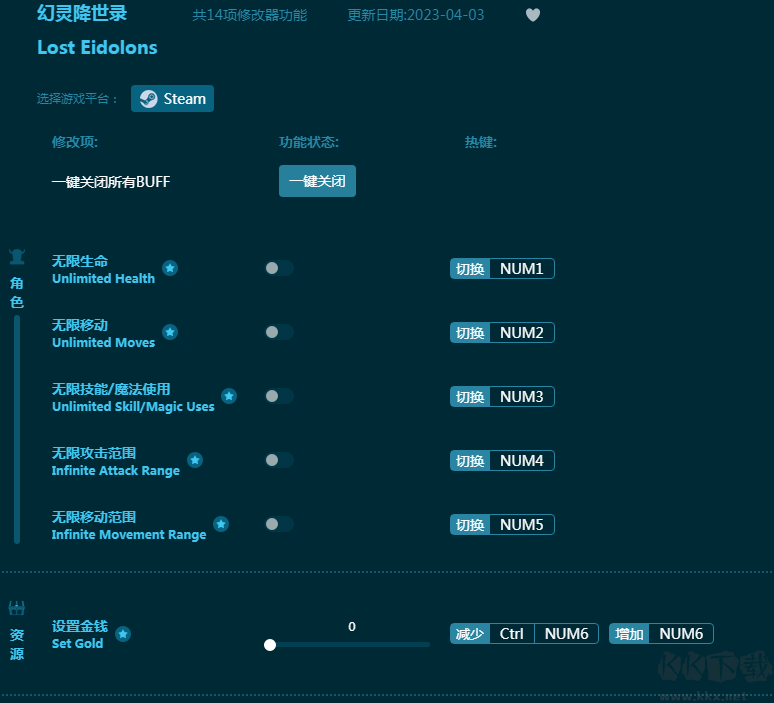 《幻灵降世录》是一款不可多得的精品战棋游戏,玩家将面临一场史诗战争。这款《幻灵降世录修改器》为玩家提供无限生命,无限移动,无限技能,无限攻击范围,无限移动范围,无限金钱等丰富的游戏辅助功能,帮助玩家力挽狂澜,游戏体验更愉快!感兴趣的朋友不要错过,KK下载站推荐大家下载体验!