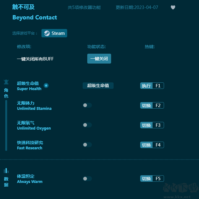 《触不可及》是一款硬核科幻游戏,玩家在外星球独自生存。这款《触不可及修改器》提供玩家超级生命值,无限体力,无限氧气,快速研究科技,体温恒定等丰富的游戏辅助,帮助玩家在外星球生活的更自在,游戏更轻松!感兴趣的朋友不要错过,KK下载站推荐大家下载体验!