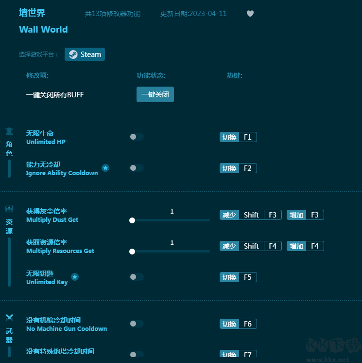 《墙世界》是一款横版冒险闯关游戏,在一面巨大的墙上,生活着不同的种族和军队,玩家要一路闯关过去。KK下载站带来这款《墙世界修改器》为玩家提供无限生命,能力无冷却,无限钥匙,没有机枪冷却时间,没有炮塔冷却等强力辅助,帮助玩家找出世界的秘密!游戏体验更佳!感兴趣的朋友不要错过,KK下载站推荐大家下载体验!